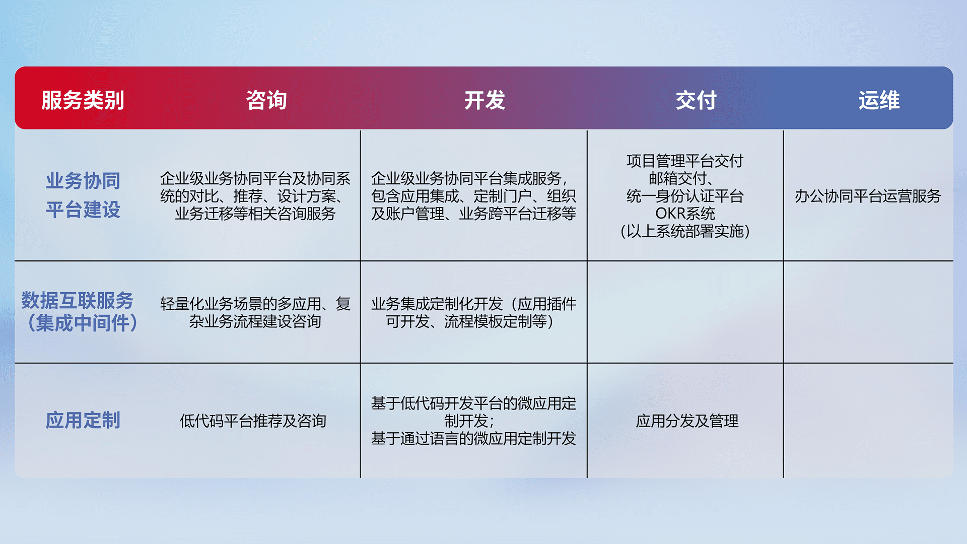 针对钉钉、、、企微、、IDaas等平台级产品提供产品的规划、、方案、、、、交付、、、定制化开发等服务,,,实现如统一协同办公、、智能客户服务、、混合会议管理、、智能数据查询、、、、等业务场景,,,,实现数字化转型。。。。
