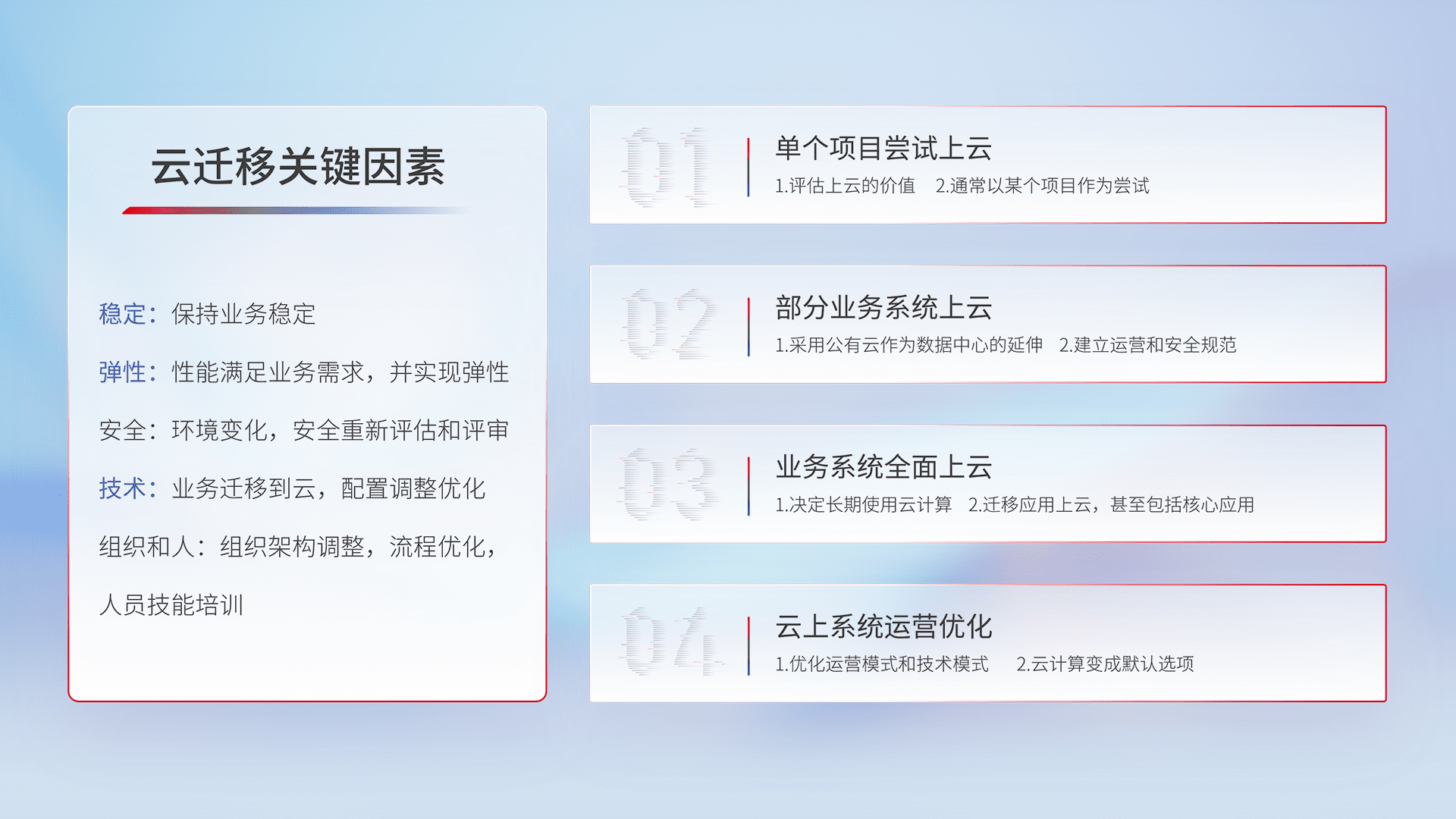 结合实际业务,,,,从规划设计、、云平台选型、、、、云原生改造、、数据迁移、、、集成交付,,,迁移全过程为客户识别最佳上云路径,,做好风险识别管理,,设计网络架构、、、、身份权限、、安全审计合规、、操作审计、、日志审计、、监控告警策略、、多站点容灾设计等,,对云上基础设施进行整体规划,,,,提升IT治理水平,,,以满足弹性、、高可用、、高性能的需求。。