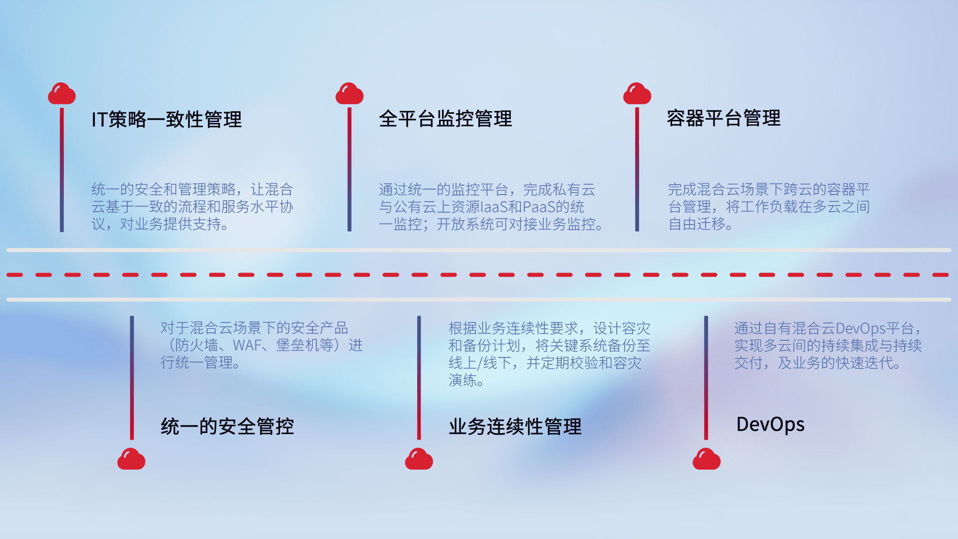 通过多云纳管,,以统一的资源数据模型把客户的云资源进行抽象和封装,,,,进而实现对多云资源的统一操作,,,,保障云资源管理的可靠性、、、稳定性与可用性。。。。量身定制化运维内容,,配置、、、开发运维、、补丁管理、、、备份、、、监控、、、、认证和访问管理、、审计和日常巡检等,,,保障在用云过程中的可靠度,,,,稳定度以及高可用率。。。。